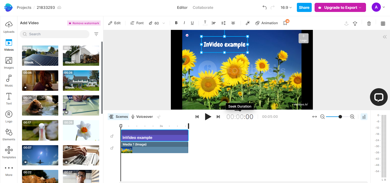 InVideo is a web-based video editor; it allows users to effortlessly perform simple operations on video such as trimming and layering, as well as adding logos, images, and text. Its strength, however, lies in its library of stock content. It has a vast amount of clips, music, and images for every situation; should this prove insufficient, you can also generate short video clips with their AI tool. However, it cannot function as a screen recorder, so you will have to use some other program for this task.