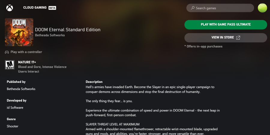 If you have an old Mac or it cannot satisfy Doom Eternal game system requirements, there is an easy solution. Cloud gaming provides you with sufficient cloud resources for a fixed fee. All you need is a small client program and a good internet connection starting from 15 Mbits/s. There are several great services, that provide such an opportunity, among the best are Boosteroid, Xbox Cloud Gaming, and Nvidia GeForce Now. Among them, only Xbox Cloud Gaming and Google Stadia have Doom Eternal in their game catalog, and you can play on any Mac computer (starting from MacOS 10.10) and even Android! Xbox Cloud Gaming and Google Stadia can stream games with high resolution (1080p), every service has its pros and cons.