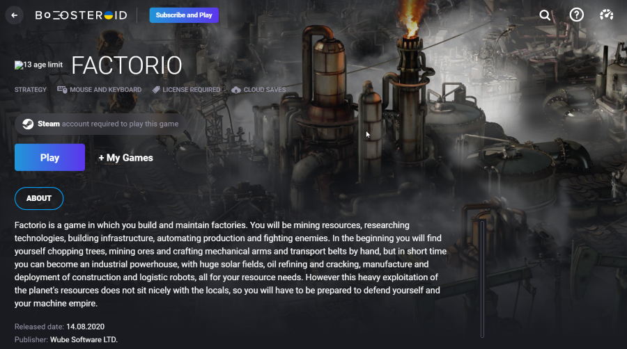 If you have an old Mac, or it cannot fully satisfy Factorio game system requirements, there is a potential solution. Cloud gaming provides you sufficient cloud resources for a fixed fee. All you need is a browser or a small client program and a good internet connection starting from 15 MBits/s. There are several great services, that provide such an opportunity, among the best are Boosteroid and Nvidia GeForce Now. Both services have Factorio in their game catalog and allow you to play full-functional game on Mac, iPad or old Windows PC.