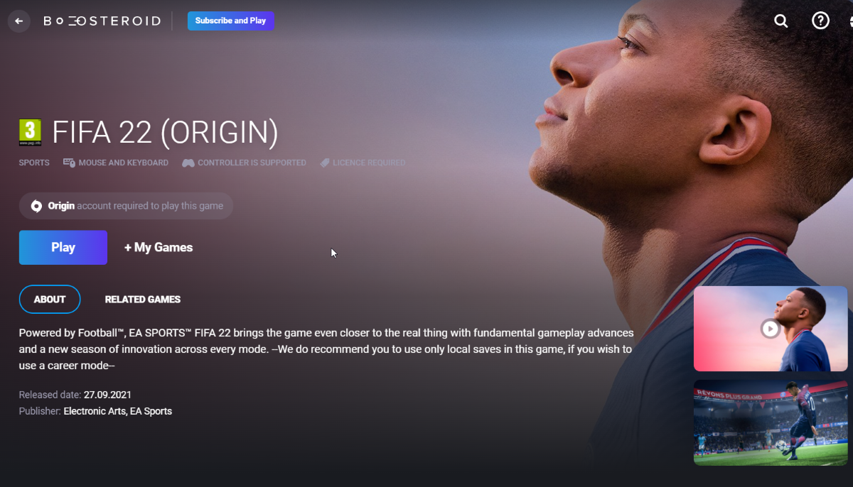 If you have an old Mac or it cannot satisfy FIFA 22 game system requirements, there is an easy solution. Cloud gaming provides you with sufficient cloud resources for a fixed fee. All you need is a small client program (or just a browser in the case of Boosteroid) and a good internet connection starting from 15 Mbits/s. There are several great services, that provide such an opportunity, among the best are Boosteroid. Boosteroid have FIFA 22 in their game catalog, Boosteroid offers the game via Origin or Steam, while if you purchase FIFA 22 ($35.99) in Google Stadia it will only be available on this platform. Cloud gaming allows you to play it on any Mac device and even Android in 1080p or 4k!