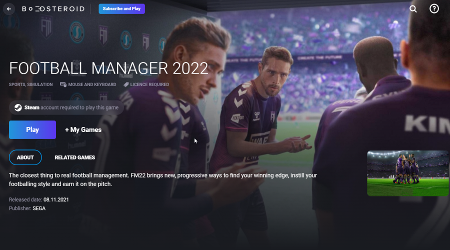 If you have an old Mac or it cannot satisfy Football Manager 2022 game system requirements, there is an easy solution. Cloud gaming provides you with sufficient cloud resources for a fixed fee. All you need is a browser or a small client program and a good internet connection starting from 15 Mbits/s. There are several great services, that provide such an opportunity, among the best are Boosteroid, Xbox Cloud Gaming, AirGPU, Google Stadia, and Nvidia GeForce Now. Boosteroid and Xbox Cloud Gaming have Football Manager 2022 in their game catalog, so and you can play it on any Mac device, old Windows PC, and even Android!